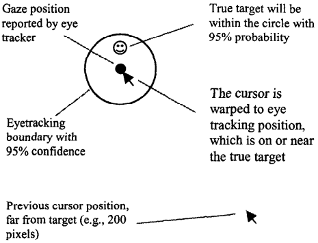 Summary: Here, the mouse cursor is warped to the gaze point, after which the user continues with using the mouse. This represents a first, more subtle way of using gaze — to enhance pointing, while the rest is done by the hands only. The underlying idea is that gaze is used sparingly, to avoid overloading the eyes with motor control tasks.